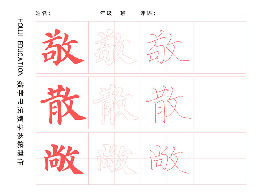 与左侧偏旁“放左收右”原则相反,右部分的偏旁须“收左放右”。以“敬”字为例,从右向左的笔画收,从左向右的笔画放,这样“一收一放,再一收,再一放”显得很有节奏感。