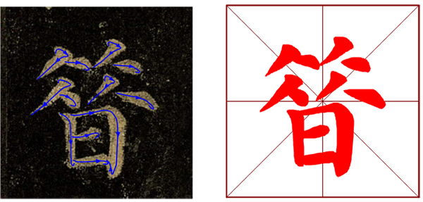 在同一副作品中,为了追求变化,相同字最好能避免雷同、单调,可采用多种方式进行变化,以楷书为例,借鉴其他字体的字形,如篆、隶、草等。然后再使之点画同化为楷书的用笔,结构异化为其他字体。
